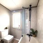 Les salles de bains de Skye View Lodge comprennent également une douche à l'italienne et une toilette séparée. Un sèche-cheveux et des serviettes font également partie des articles de toilette.